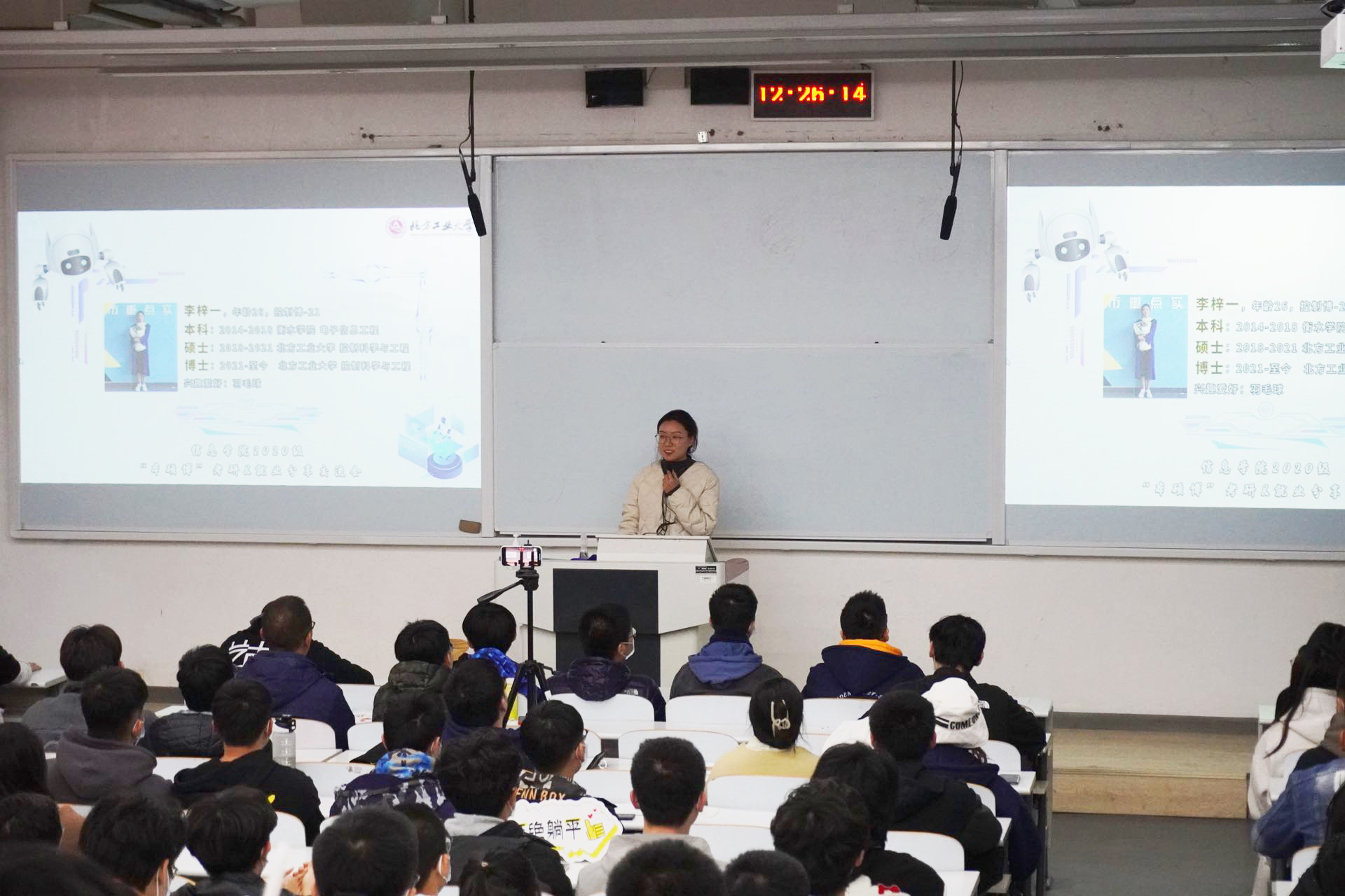 本次系列交流活动以本为基,以硕促学,以博启志,旨在引导员工践行“请党放心、强国有我”的青春誓言,在大三的关键节点,结合自身情况,快速、正确树立毕业目标。在交流启动仪式中,就业、求学经验丰富的“80后师兄”魏路与“励志学长”张一将自己当作鲜活的例子,细致讲述个人本科、读研、就业、申博等成长历程,希望同学们能把握好专业优势,正确衡量个人能力,早日确定目标,凝心聚力再出发;控制博-21班的李梓一在谈到考研、读博经历时,她说到:“我从小到大都不是尖子生,但从本科到考研再到读博,我始终相信克服困难就是赢得机遇,只要不断努力,终会遇到更好的自己”。会议的最后,李欣悦同学结合暑期社会实践的所见所闻,为同学们分享了8名优秀员工就业经历与建议,用身边人讲身边事,身边事教身边人。交流会台下虚无坐席,同学们均认真聆听优秀学长成长经验,为自己加油充电。