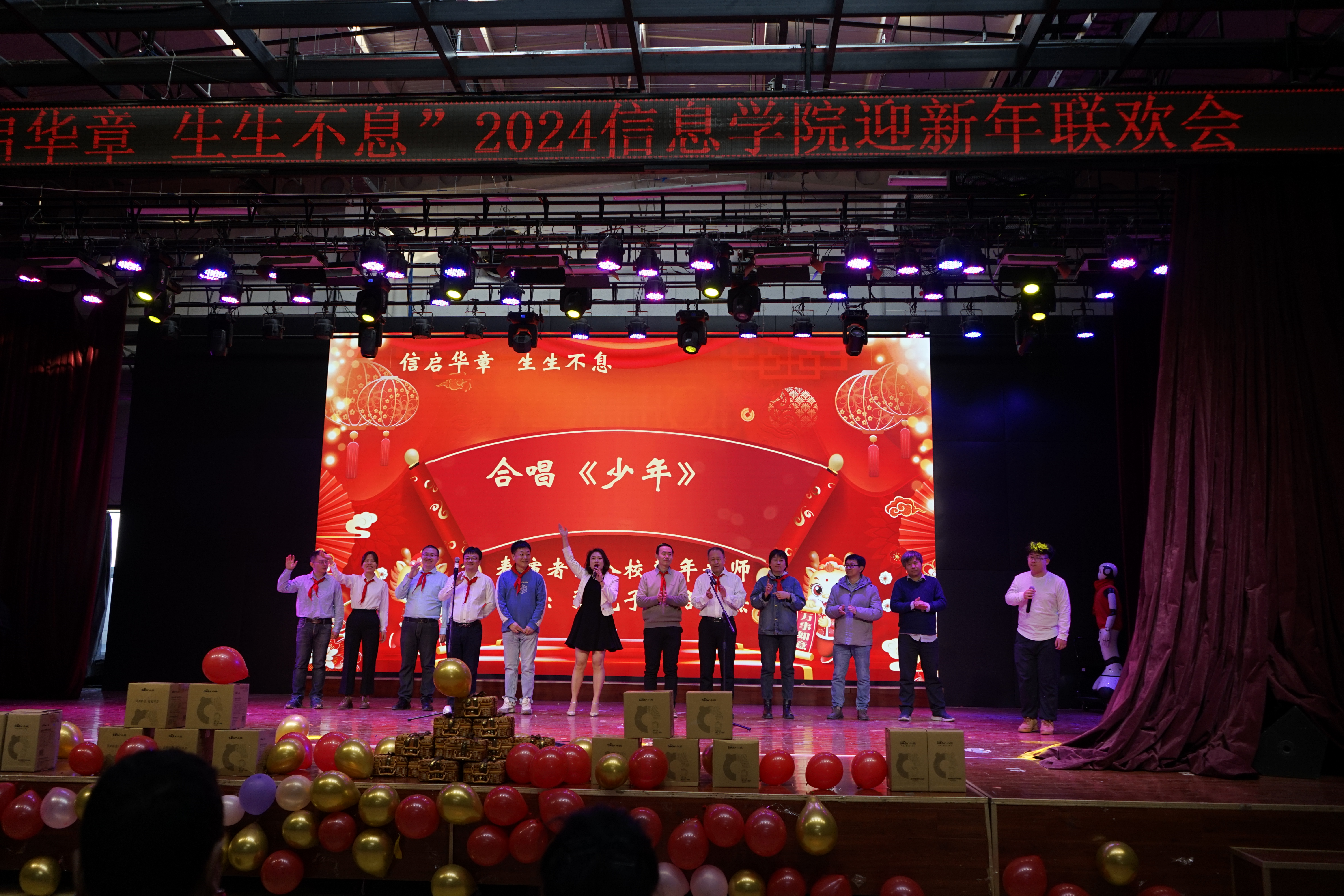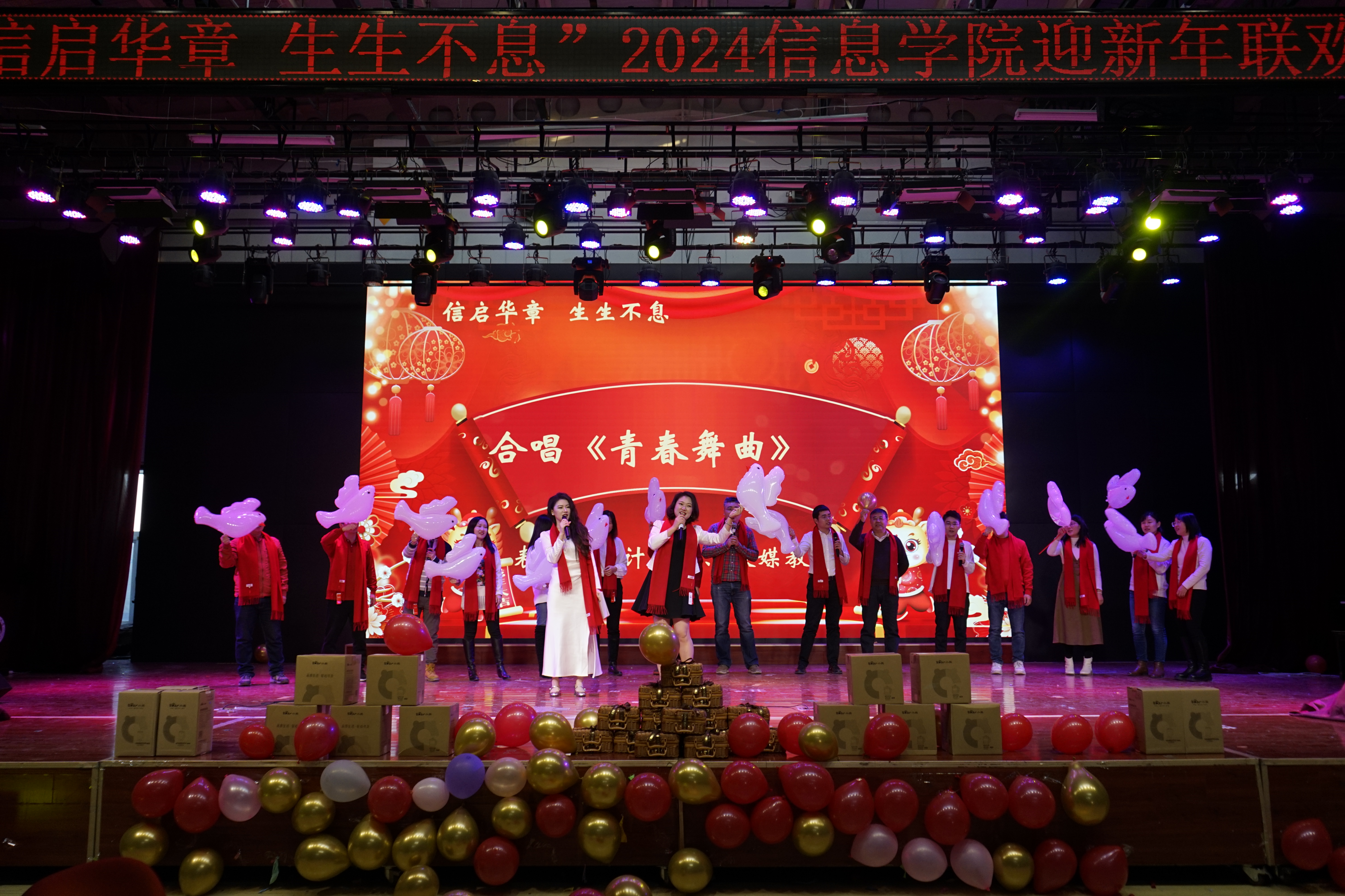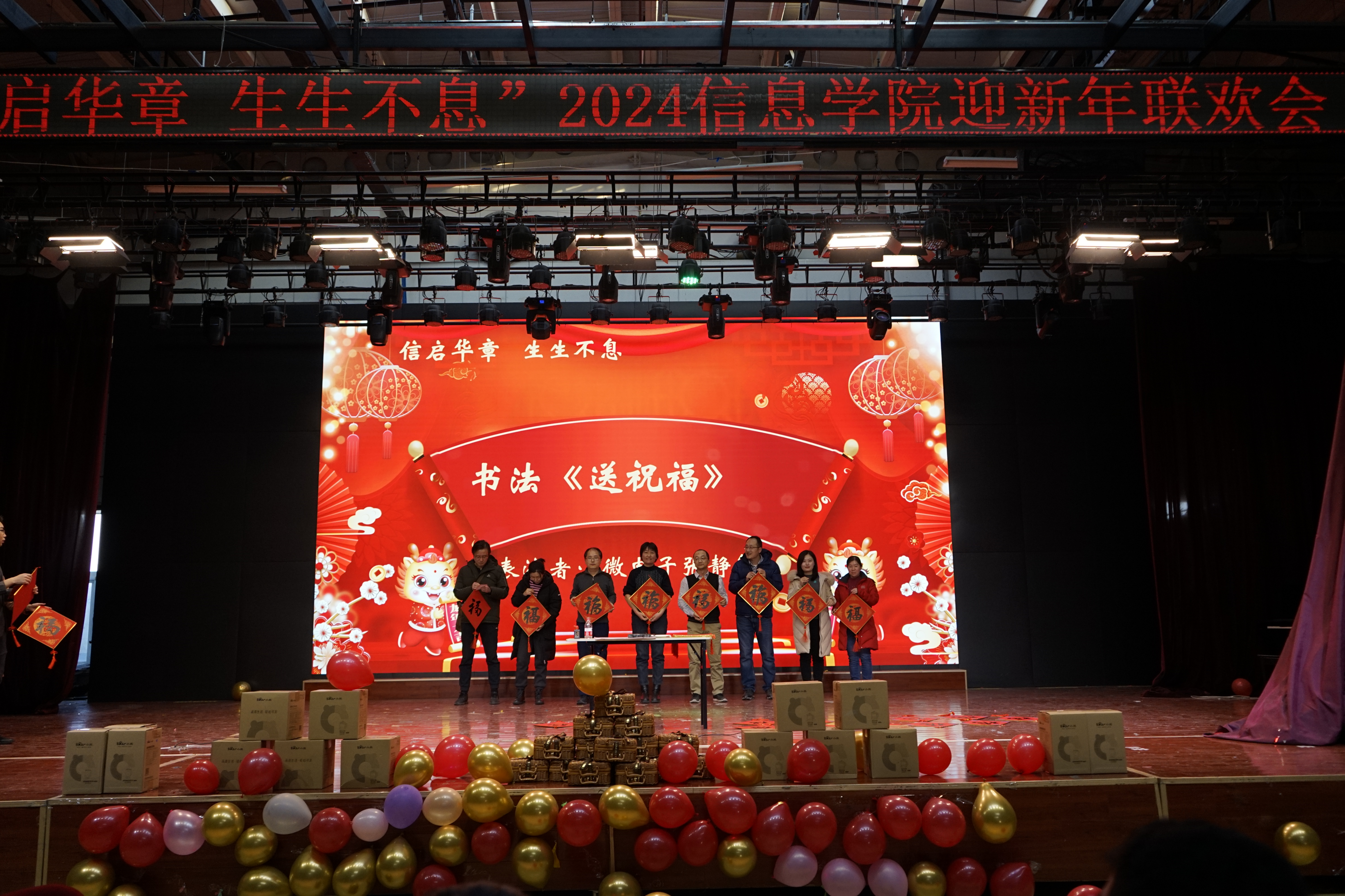 迎新年联欢会上,各个系、中心老师通过歌曲《少年》《外婆的澎湖湾》《青春舞曲》、诗朗诵《我爱上班》、人机舞蹈《舞动未来》《龙行龘龘贺新年》、创意视频配音节目《告白》以及现场毛笔字《送祝福》等节目,为大家来了欢歌笑语的同时,也把新春祝福送到了大家心坎里。