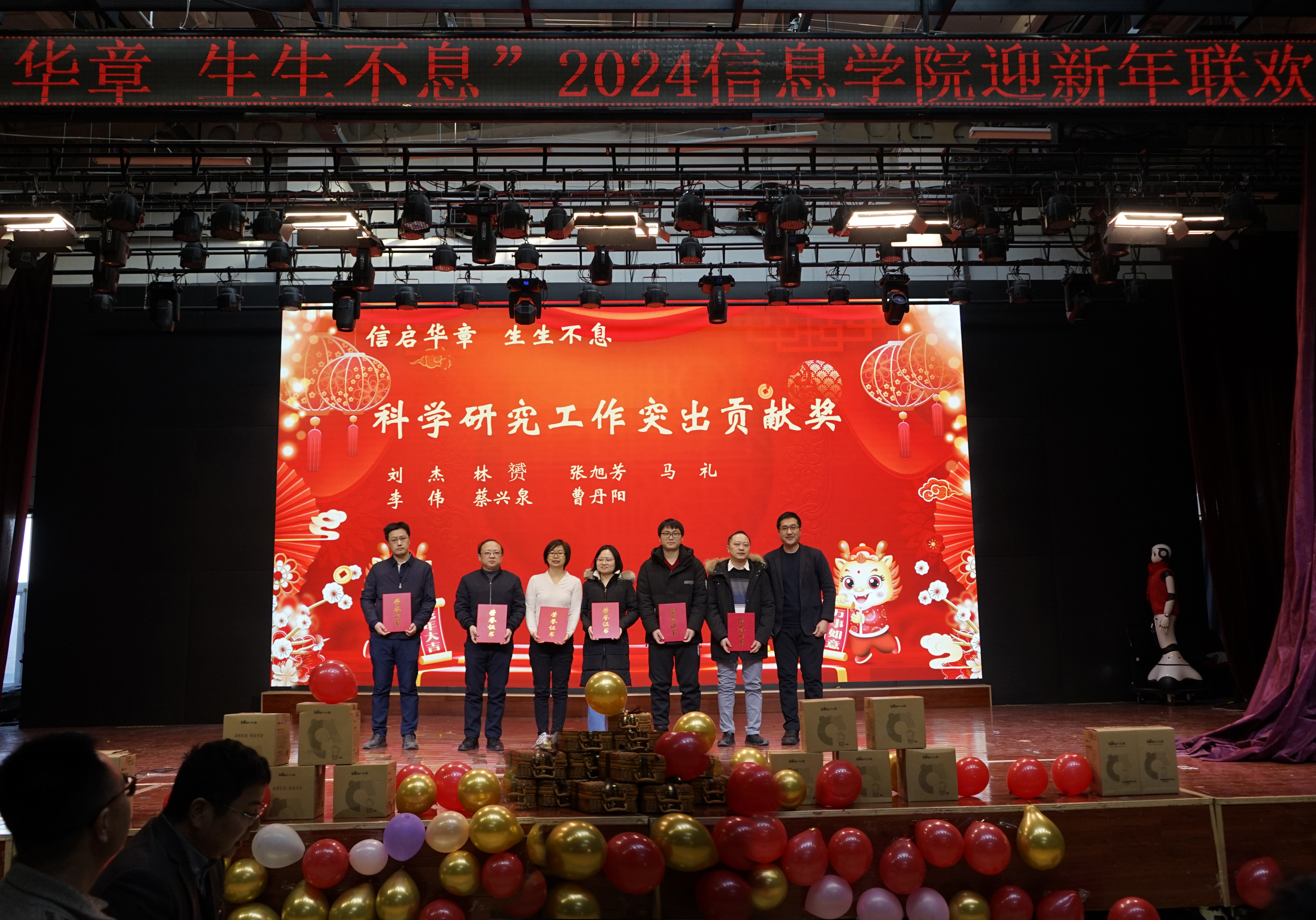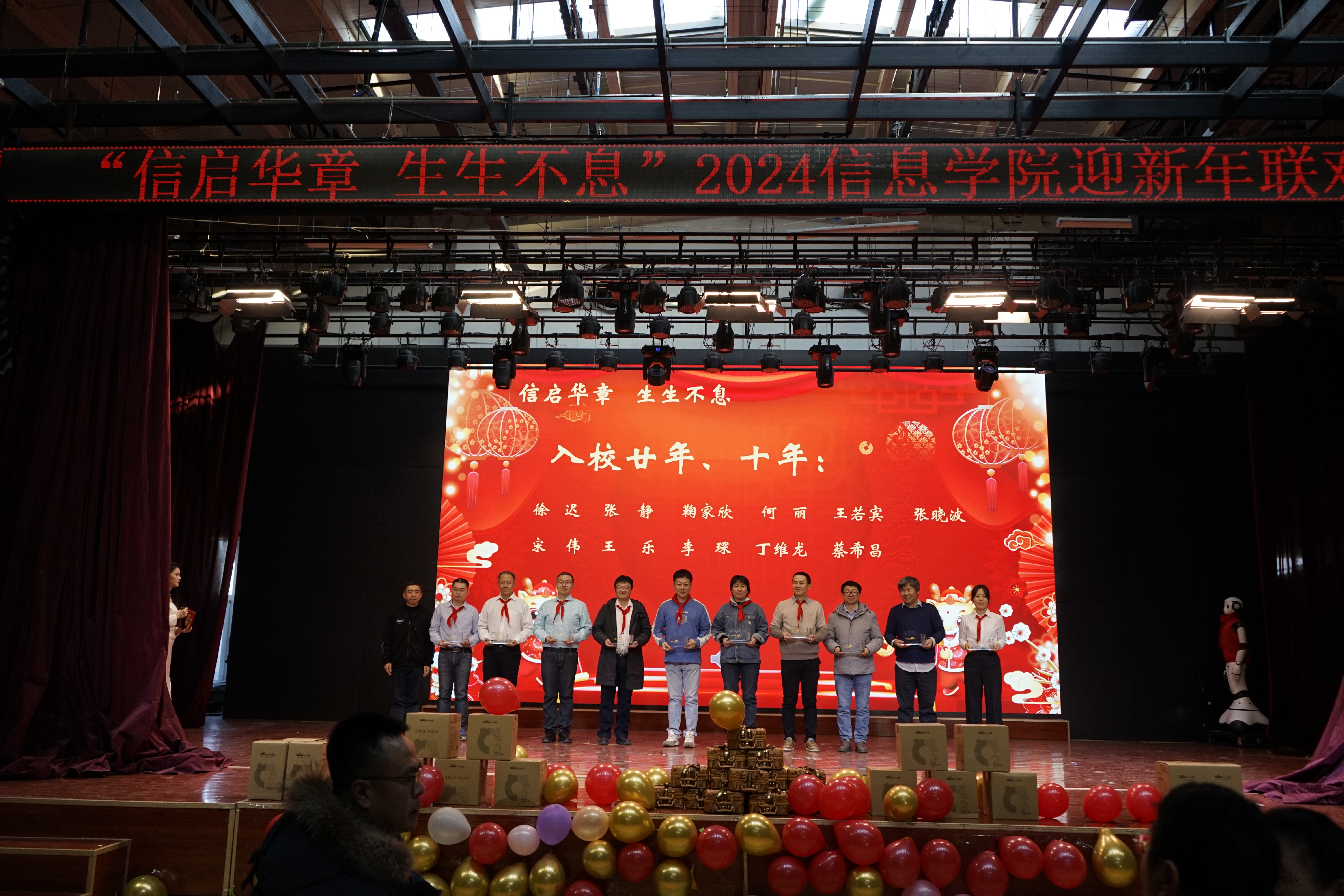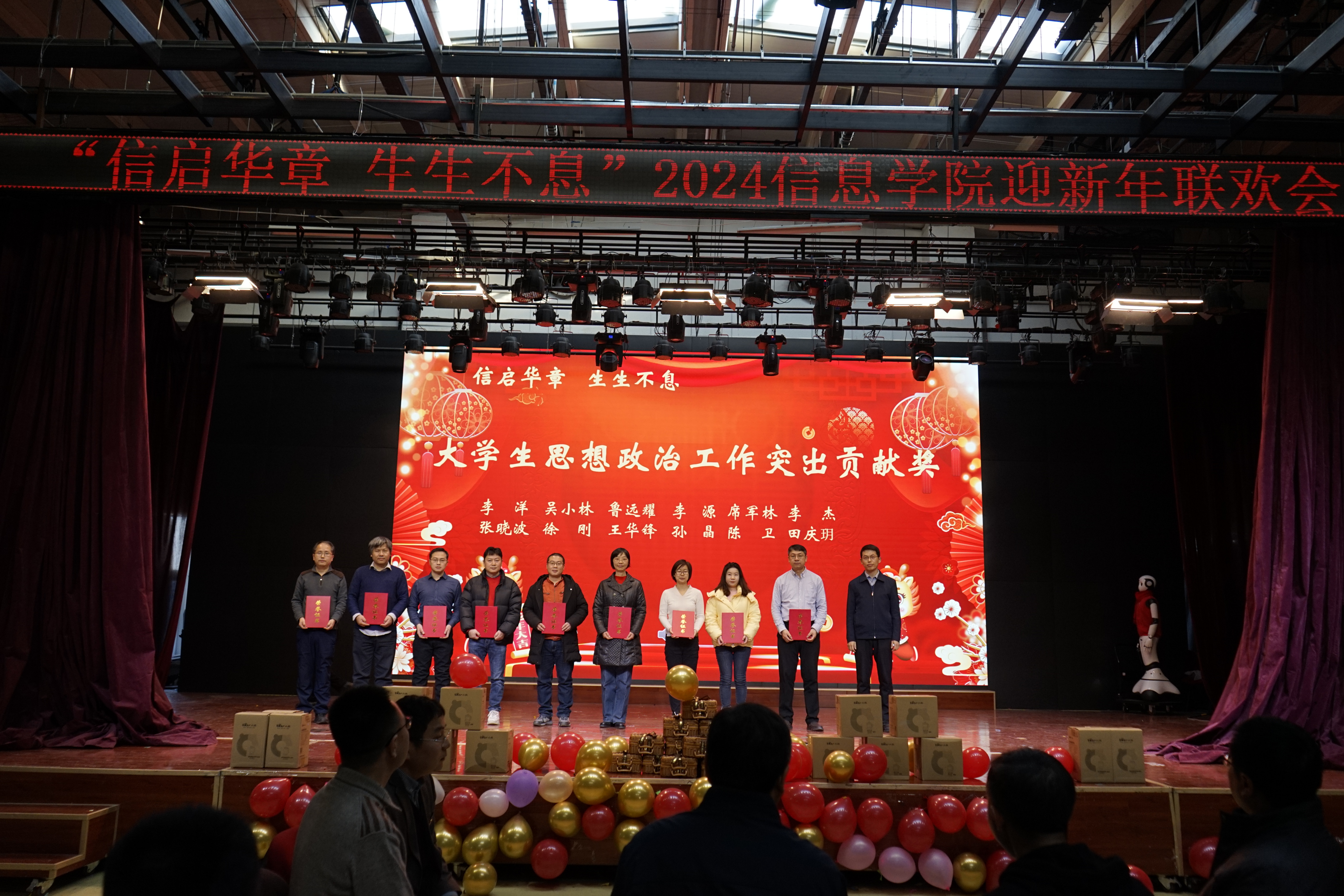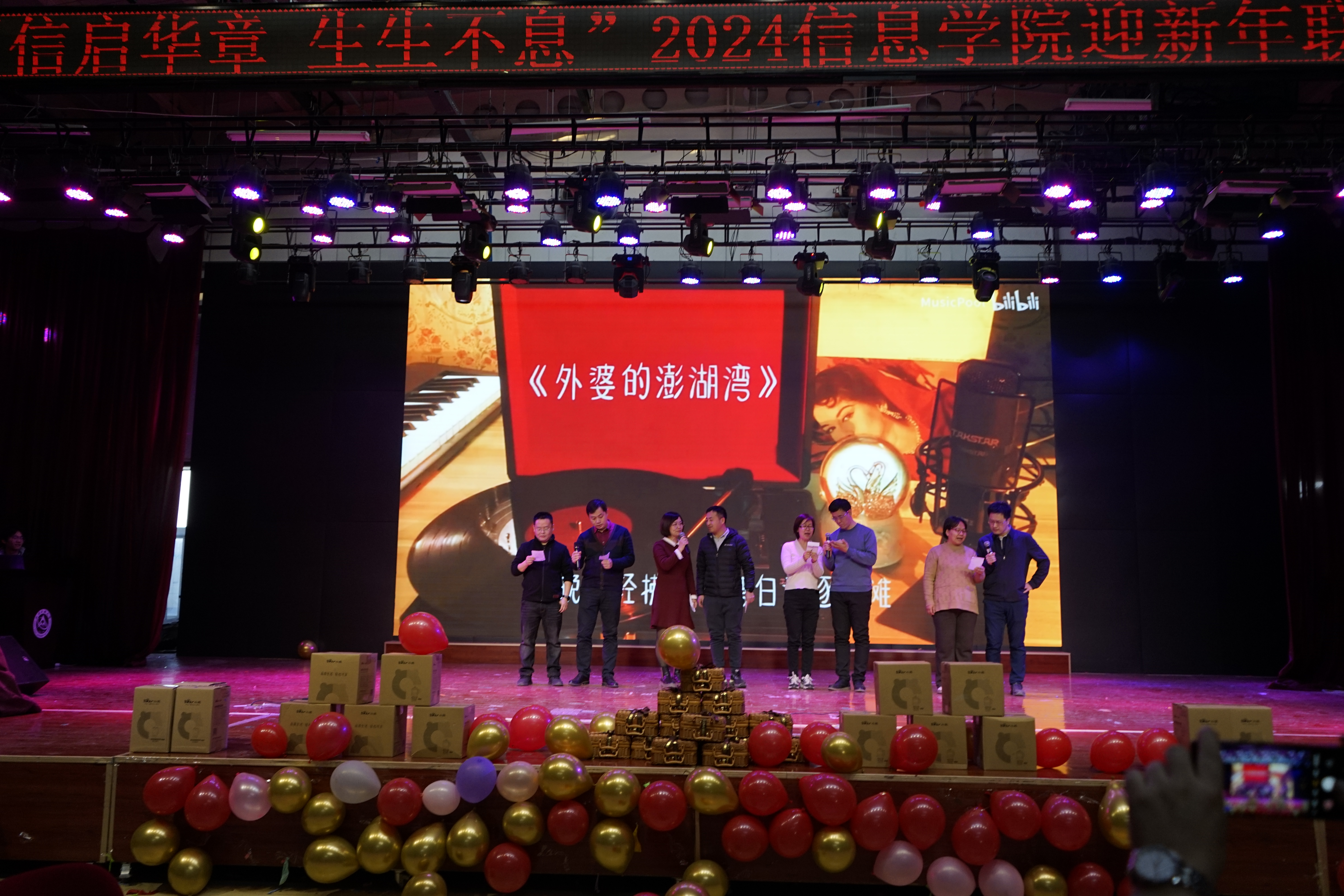 迎新年联欢会上,各个系、中心老师通过歌曲《少年》《外婆的澎湖湾》《青春舞曲》、诗朗诵《我爱上班》、人机舞蹈《舞动未来》《龙行龘龘贺新年》、创意视频配音节目《告白》以及现场毛笔字《送祝福》等节目,为大家来了欢歌笑语的同时,也把新春祝福送到了大家心坎里。